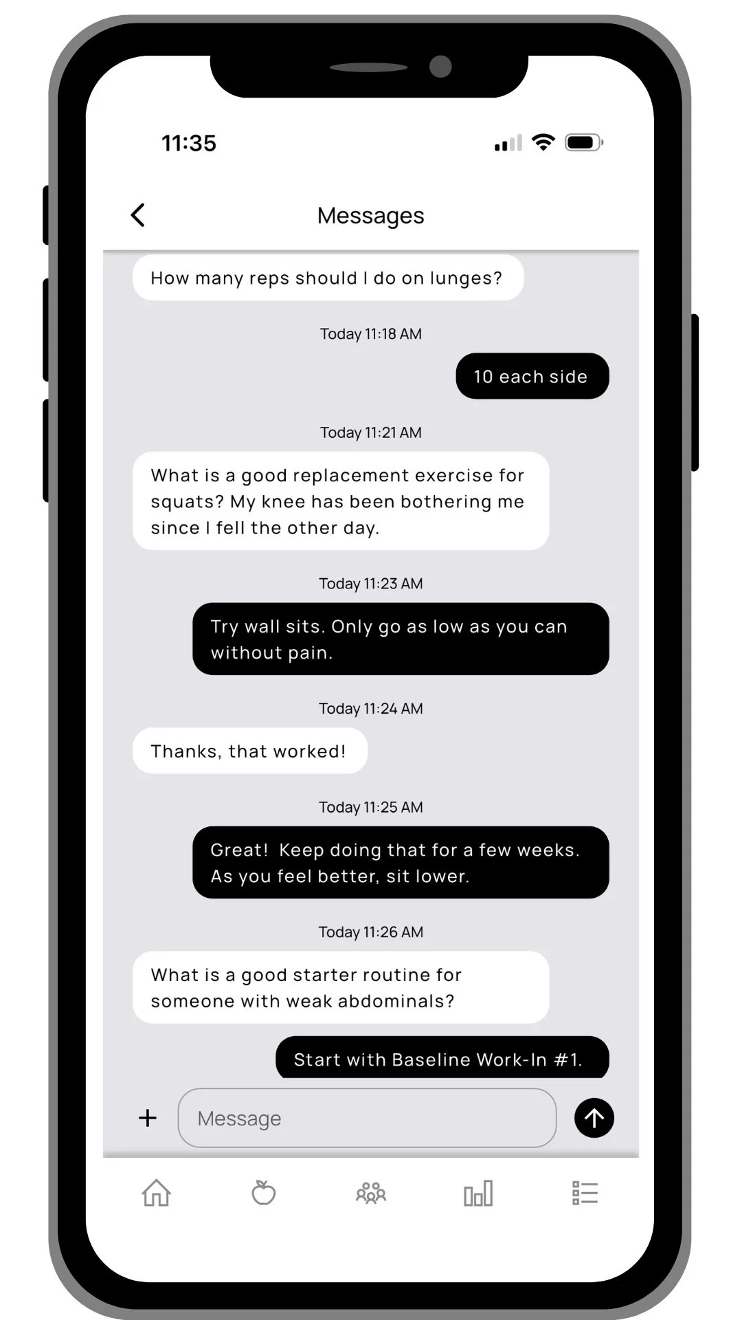 Communication is encouraged! Use in-app messaging and form check video exchange to ensure that you are doing the exercises correctly and getting great results.