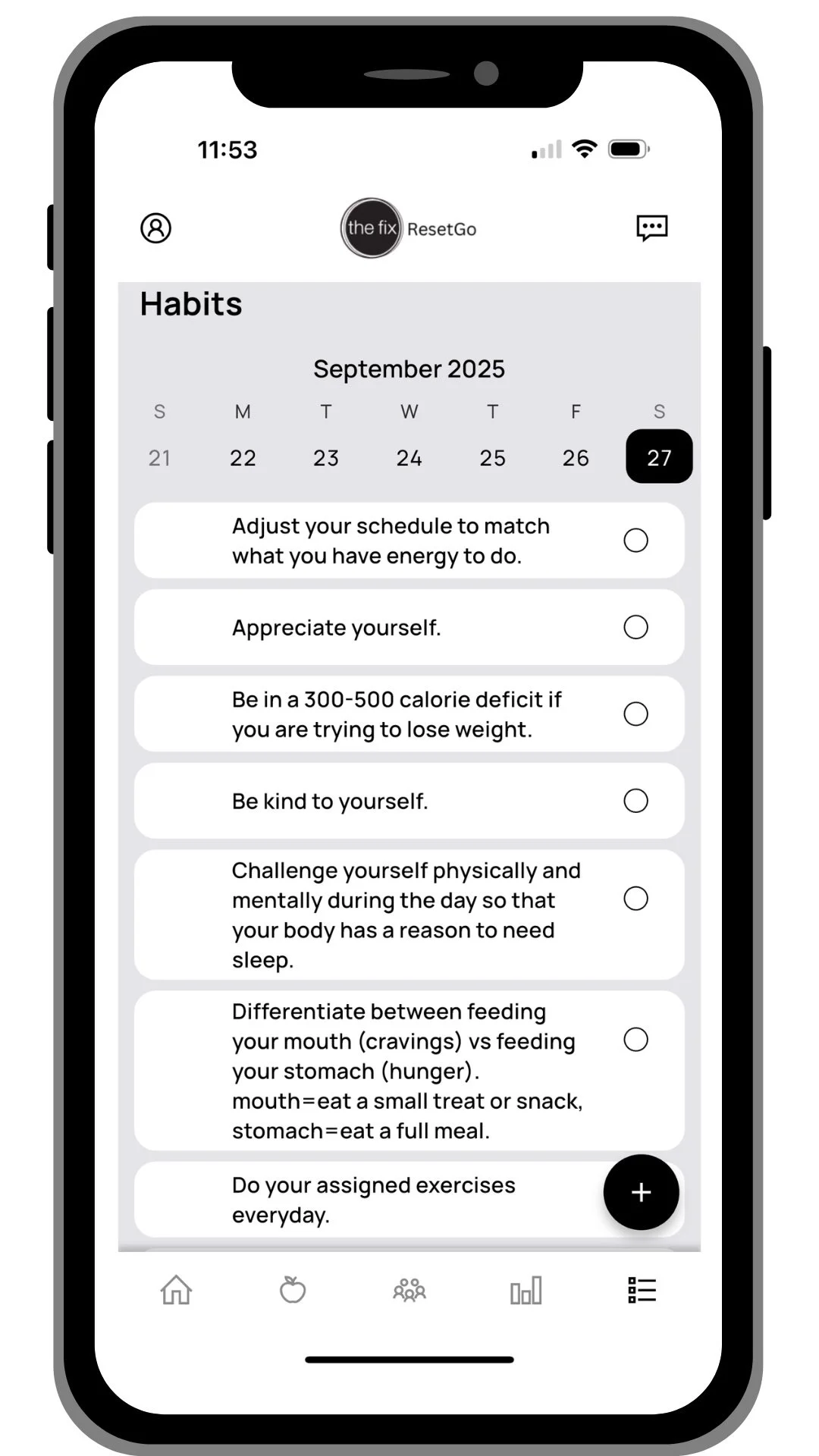 Crush bad habits by building new healthy habits with habit tracking. Filling your life with healthy habits and self-awareness is essential for personal growth. Monitoring your behavior can help you recognize and break negative cycles, reinforce positive actions, and improve consistency while developing sustainable routines, which are essential for long-term well-being. Find inspiration in ResetGo’s suggested habits, or create your own habit list based on the behaviour changes required for you to accomplish your goals. Big successes are built on many small repeatable lifestyle changes.