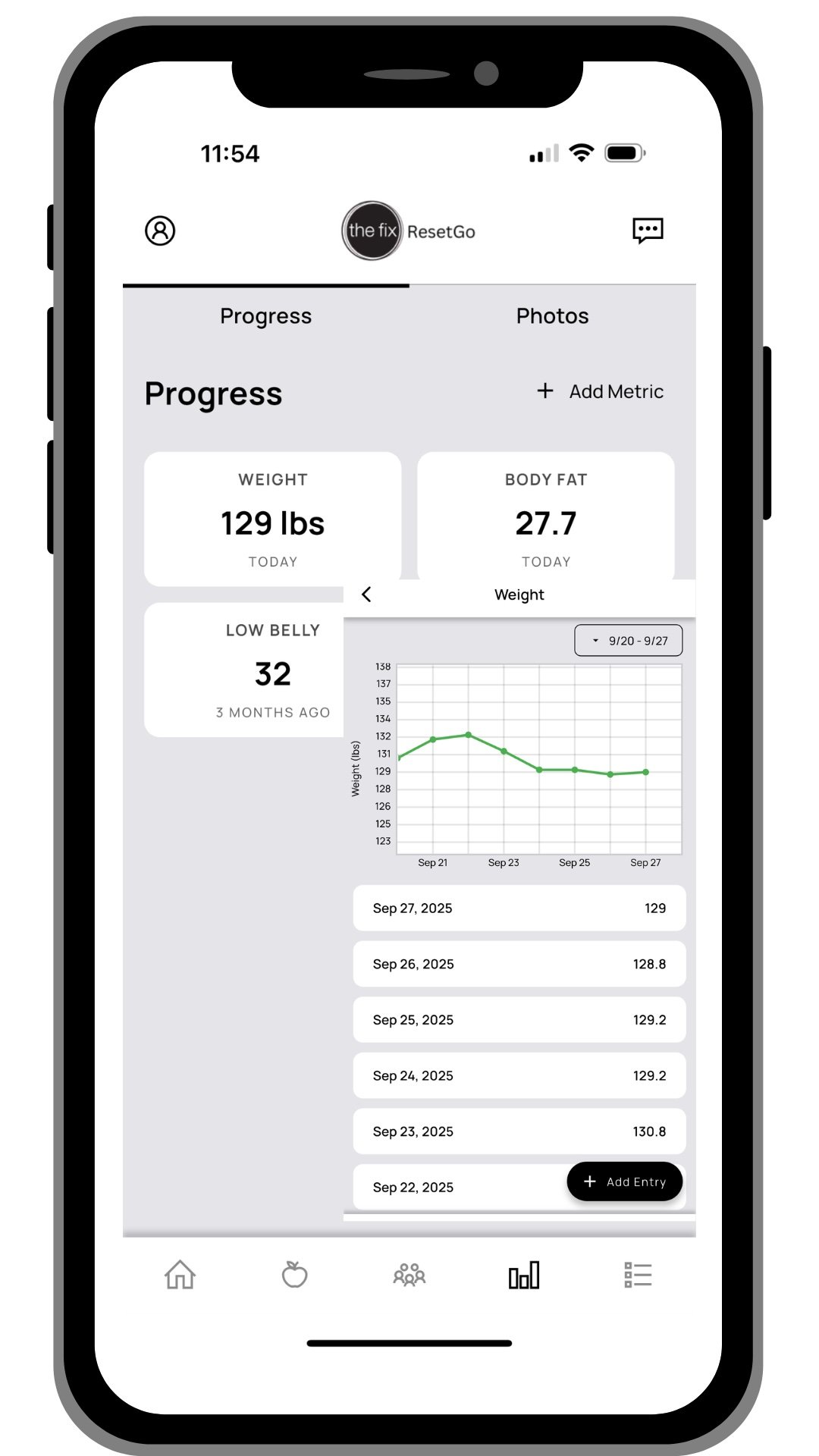 Track progress in any metric you choose, ie, weight, body fat, weight lifting PR’s, workout streaks, body part measurements, photos, etc. Tracking your chosen metrics increases your likelihood of success by helping you identify patterns, make informed adjustments, and set realistic goals. The process of measuring your progress can also make your entire fitness journey more efficient by keeping you focused on what’s giving you the best results and preventing you from wasting time on strategies that aren’t giving you the results you want. Keep yourself accountable and celebrate your small wins by tracking.
